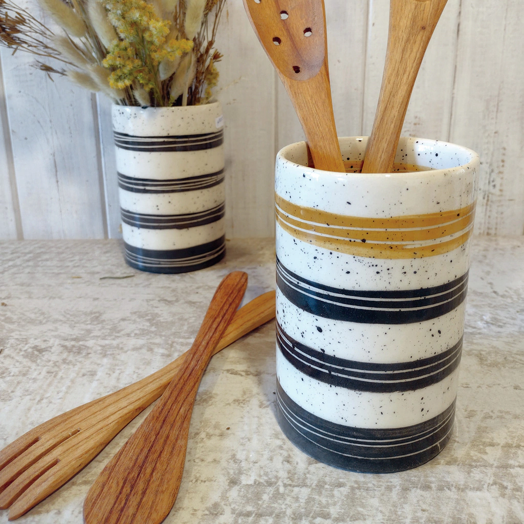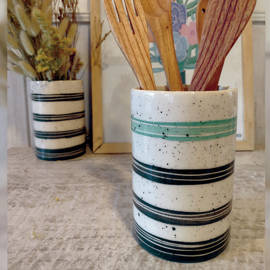 Puede ser utilizado en la cocina como porta utencillos, también puede ser hermoso florero, como mas te guste. (sin tapa)